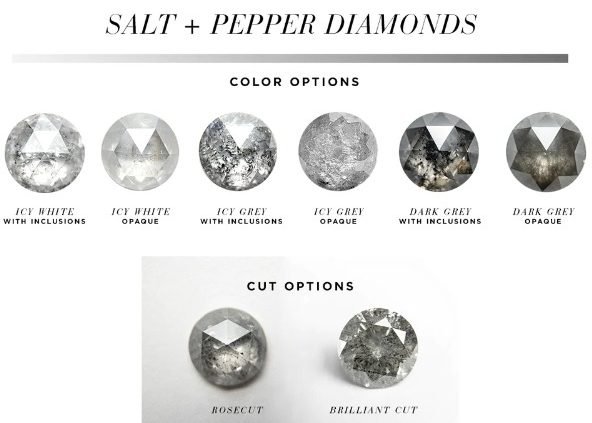 Cuando se habla de diamantes «sal y pimienta» se hace referencia a un diamante que tiene una mezcla de muchas inclusiones en blanco y negro, lo que le da a la piedra un aspecto gris sedoso y moteado.